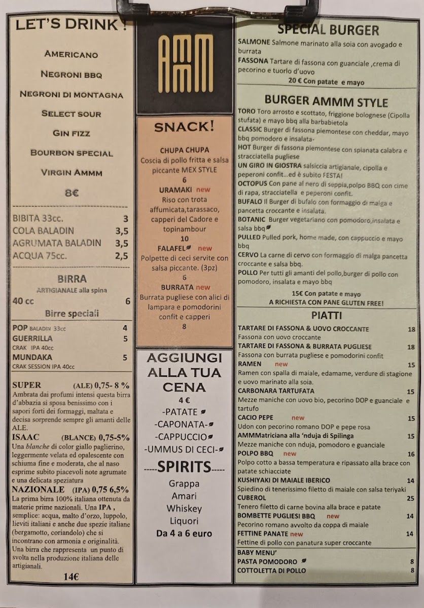 Welcome to AMMM BISTROT, a hidden gem located on Via Mazzini in Calalzo di Cadore, Italy. This vibrant restaurant is a haven for food lovers seeking a delightful dining experience. The star of the menu is undoubtedly the Carbo Burger, hailed as the best by many guests. Diners rave about the variety, from innovative toppings to classic options, ensuring there's something for everyone.